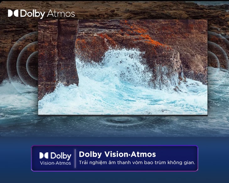 – Công nghệ Dolby Atmos, đây là chuẩn âm thanh cao cấp nhất trên các dòng tivi hiện nay. Công nghệ này có khả năng phát ra mọi âm thanh của từng vật thể trong cùng 1 cảnh tại 1 thời điểm với không gian âm thanh đa chiều sống động (lên đến 128 loại âm thanh khác nhau), mang đến trải nghiệm âm thanh mạnh mẽ như đang trôi xung quanh bạn, thậm chí cả vùng không gian phía trên đầu, cho bạn trải nghiệm điện ảnh thực sự.