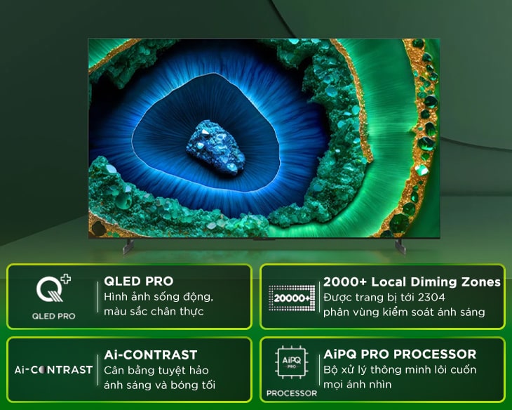 Hãng TCL trang bị cho siêu phẩm tivi Mini LED thế hệ mới này bộ xử lý AiPQ Pro tân tiến với nhiều thuật toán AI thông minh. Chip này sở hữu cơ sở dữ liệu phong phú về thế giới tự nhiên nên có thể mô phỏng và tối ưu hóa mọi nội dung hiển thị, từ đó giúp cho các hình ảnh đầu ra sở hữu màu sắc sống động, độ tương phản tuyệt vời và độ rõ nét ấn tượng.