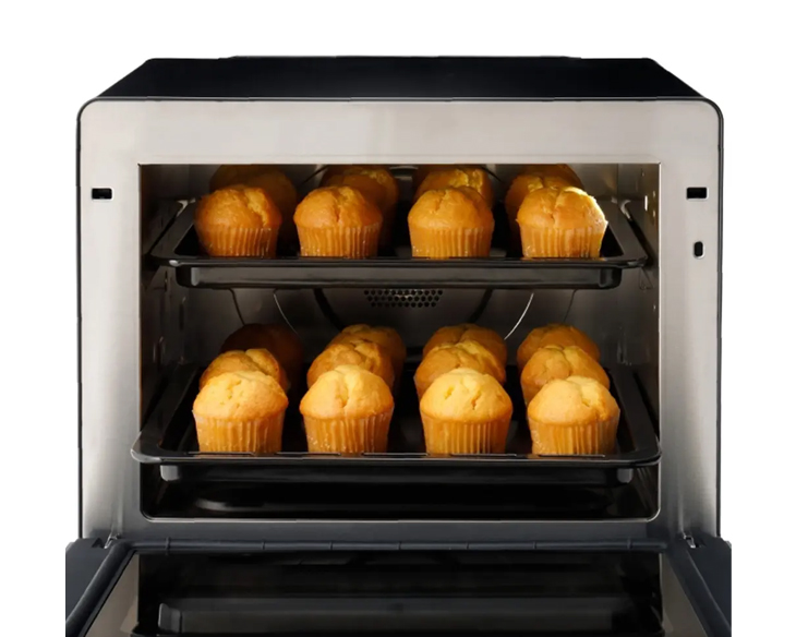 2 tầng khay di động giúp bạn có thể chế biến nhiều thức ăn cùng lúc. Dòng khí nóng đối lưu luân chuyển trong lò giúp món ăn chín đều cả 2 tầng mà không cần lật trở.