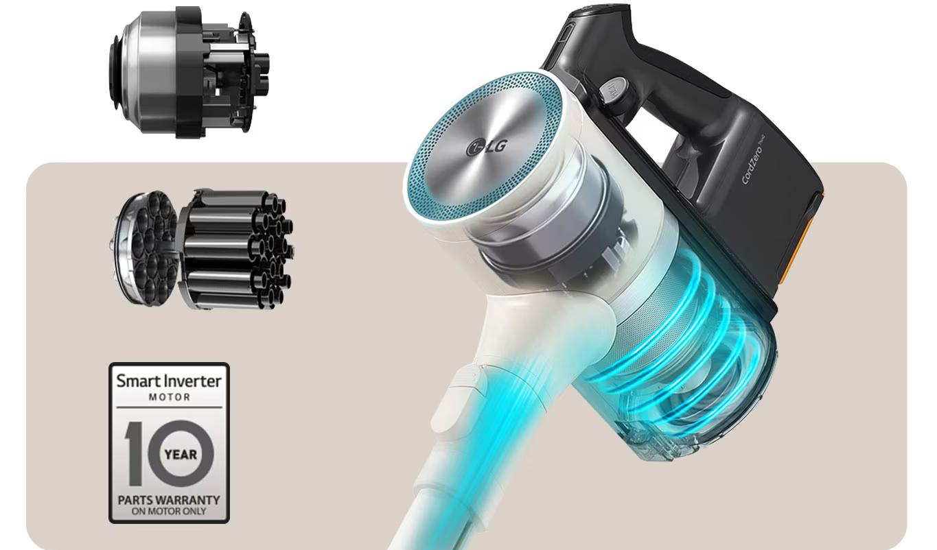 Lực hút mạnh mẽMáy hút bụi LG A9T-ULTRA tích hợp cả 2 động cơ Smart Inverter Motor và Axial Turbo Cyclone hoạt động độc lập tạo ra lực hút vô cùng mạnh mẽ. Động cơ không chổi Smart Inverter Motor quay ở tốc độ cao hút toàn bộ các hạt bụi, tóc lên một cách dễ dàng, sau đó động cơ Axial Turbo Cyclone sẽ tạo ra các luồng gió xoáy nhỏ bên trong máy để tách và lọc các hạt bụi.