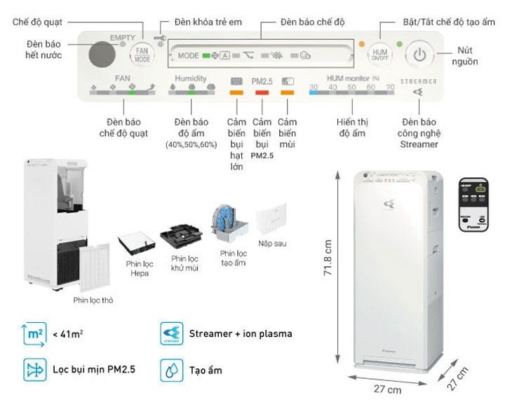 Đèn báo chất lượng không khí, Có bánh xe di chuyển, Khóa trẻ em, điều khiển từ xa