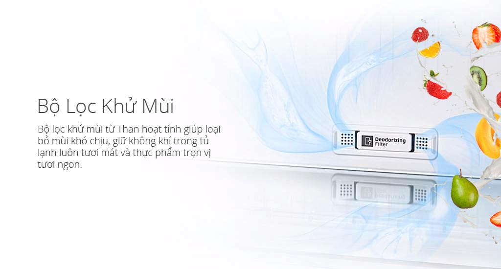 Bộ lọc khử mùi từ Than hoạt tính giúp loại bỏ mùi khó chịu, giữ không khí trong tủ lạnh luôn tươi mát và thực phẩm trọn vị tươi ngon.