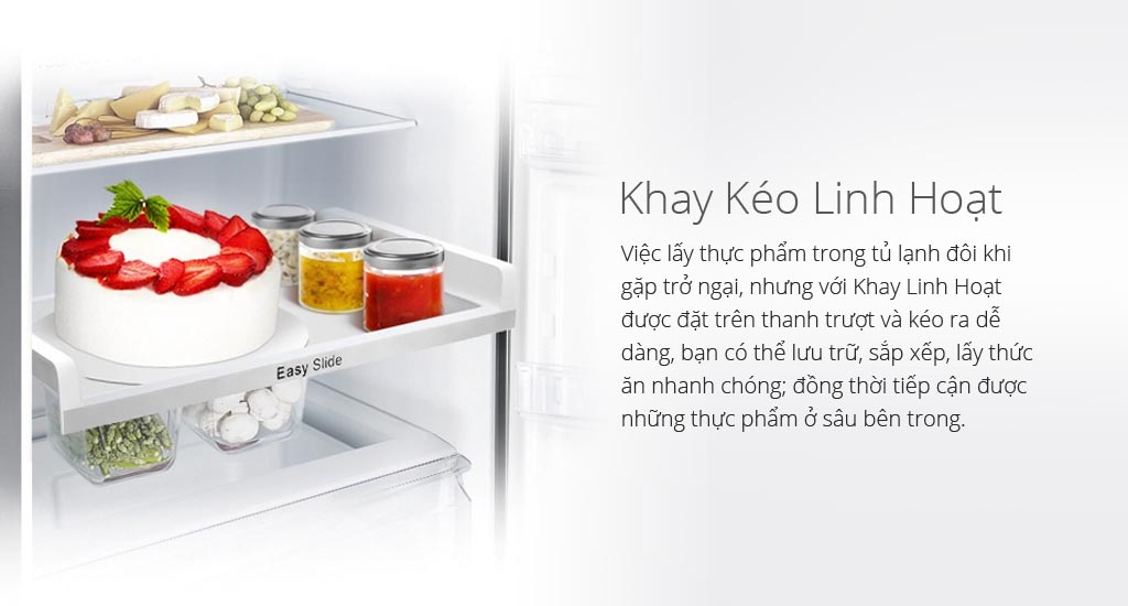 Việc lấy thực phẩm trong tủ lạnh đôi khi gặp trở ngại, nhưng với Khay Linh Hoạt được đặt trên thanh trượt và kéo ra dễ dàng, bạn có thể lưu trữ, sắp xếp, lấy thức ăn nhanh chóng; đồng thời tiếp cận được những thực phẩm ở sâu bên trong.