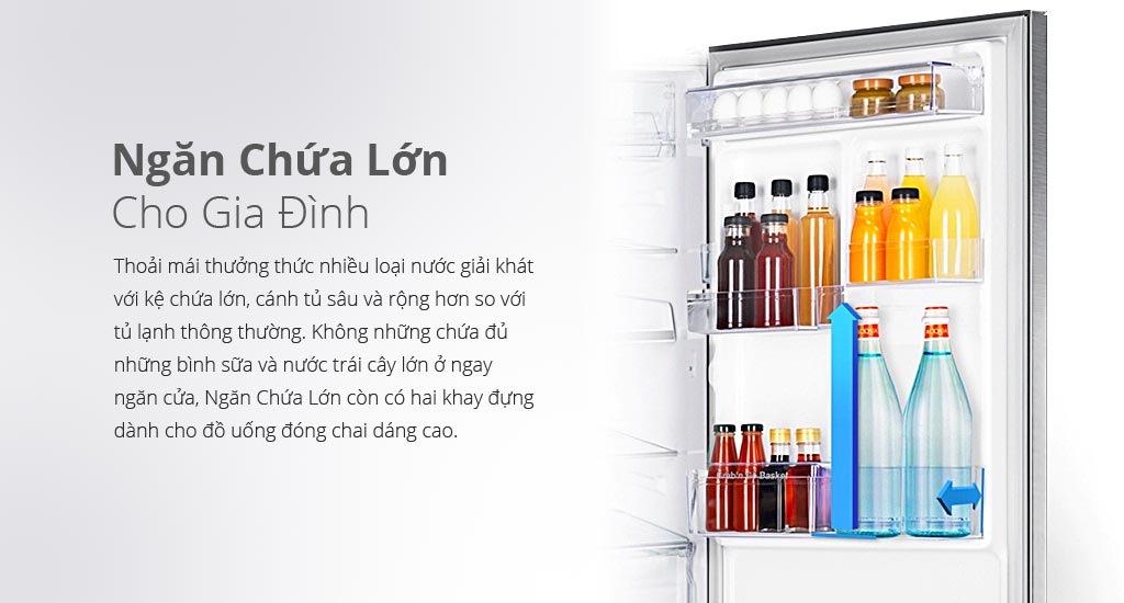 Thoải mái thưởng thức nhiều loại nước giải khát với kệ chứa lớn, cánh tủ sâu và rộng hơn so với tủ lạnh thông thường. Không những chứa đủ những bình sữa và nước trái cây lớn ở ngay ngăn cửa, Ngăn Chứa Lớn còn có hai khay đựng dành cho đồ uống đóng chai dáng cao.