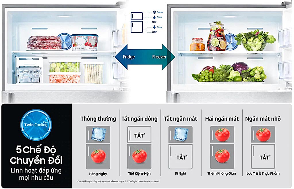 Với công nghệ 2 dàn lạnh độc lập duy nhất chỉ có tủ lạnh Samsung cho phép người dùng linh hoạt sử dụng một trong 5 chế độ tùy theo nhu cầu. Chuyển đổi ngăn đông thành ngăn mát thêm không gian lưu trữ (chế độ Hai ngăn mát) hoặc tắt hẳn một trong hai ngăn để tiết kiệm điện năng khi không có nhu cầu sử dụng (chế độ Tiết kiệm điện, Du lịch, Ngăn mát nhỏ), vừa tiện lợi, vừa tiết kiệm.