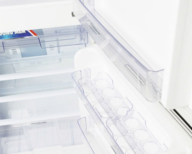 Ngăn đá trên có dung tích 65 lít được thiết kế 1 kệ chia làm 2 ngăn, 1 hộp làm đá và 1 khay chứa nằm ở bên cánh cửa tủ lạnh.