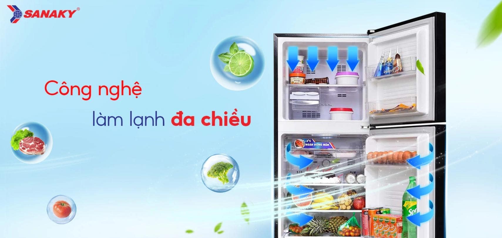 Nhờ công nghệ này, thực phẩm trong tủ lạnh Sanaky VH-249KD được bảo quản tươi ngon và kéo dài thời gian sử dụng hơn nhờ cơ chế làm lạnh nhanh, duy trì độ ẩm tốt.